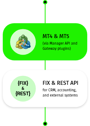 FTHUB is built for seamless connectivity. The system integrates natively with industry-standard trading platforms and connects effortlessly to third-party services through robust FIX API support.